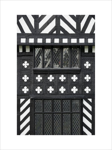 Windows and black & white timberwork on the south front at Speke Hall, Merseyside