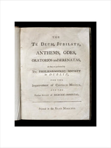 Title page of Dublin Philharmonic Society "The Te Deum, Jubilate, Anthems, Odes, Oratorios and Serenatas as they are performed by the Philharmonic Society (Dublin) 1741" part of the Springhill Library collections