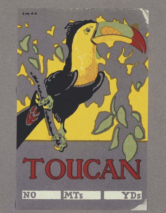 Textile Trade Label from Quarry Bank Mill depicting a brightly coloured toucan on a branch surrounded by leaves.