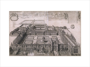 Engraving of Trinity College, Cambridge, 1690 by David Loggan (1633/5-1692) in the Study at Woolsthorpe Manor