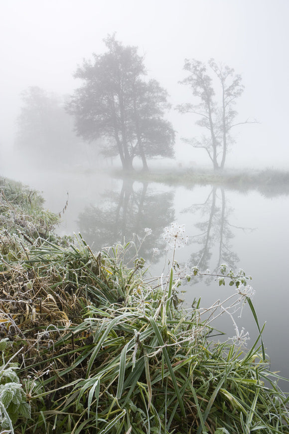 The River Wey Navigations near Triggs Lock at Send, Surrey on a misty, wintry morning showing the river with trees on the far bank