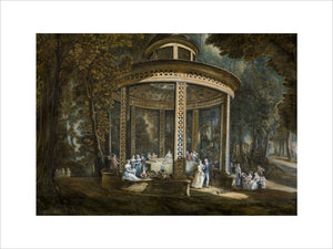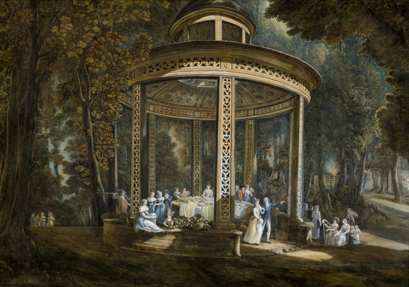 AN ASSEMBLY IN A CHINESE PAVILION a gouache drawing by Abraham-Louis-Rudolphe Ducros (1748-1810) in the Tapestry Dressing Room at Coughton Court, Warwickshire.
