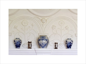 Blue and white ceramics on display against the plasterwork overmantle of the Music Room at Westwood Manor, near Bradford-on-Avon, Wiltshire.