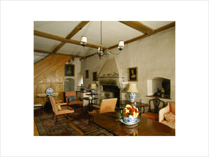 View towards stone fireplace in the solar or withdrawing room. Compton Castle is a fortified manor house built at three periods.