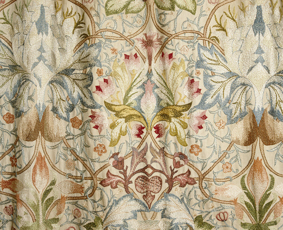 Close view of silk embroidered wall hanging in the North Bedroom at Standen, West Sussex. It was embroidered by Margaret Beale and her three eldest daughters in about 1896 and are based on the William Morris design Artichoke.