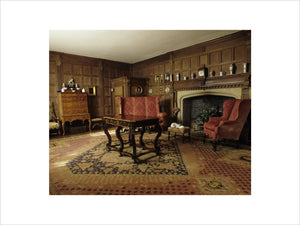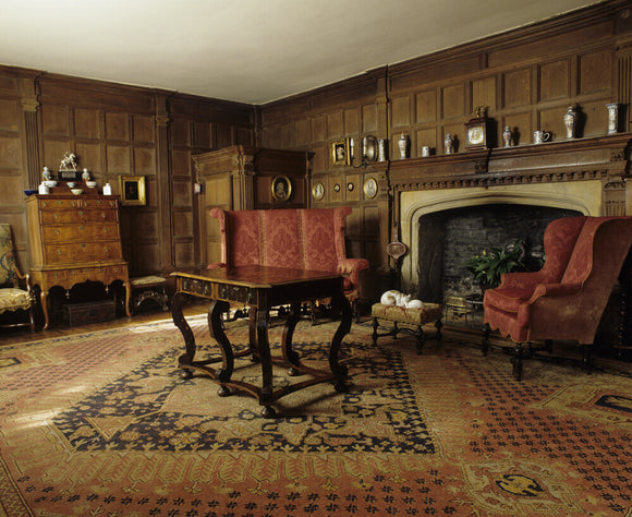 View of the Great Parlour at Lytes Cary Manor, showing the fireplace, early C17th panelling, internal porch, early C18th walnut chest of drawers, chair and red damask high back walnut settee typical of 1690's.